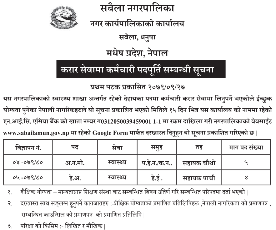 ANM,HA | Sabaila Nagarpalika | latest jobs 2023 : Advertisement number: 04-079/80