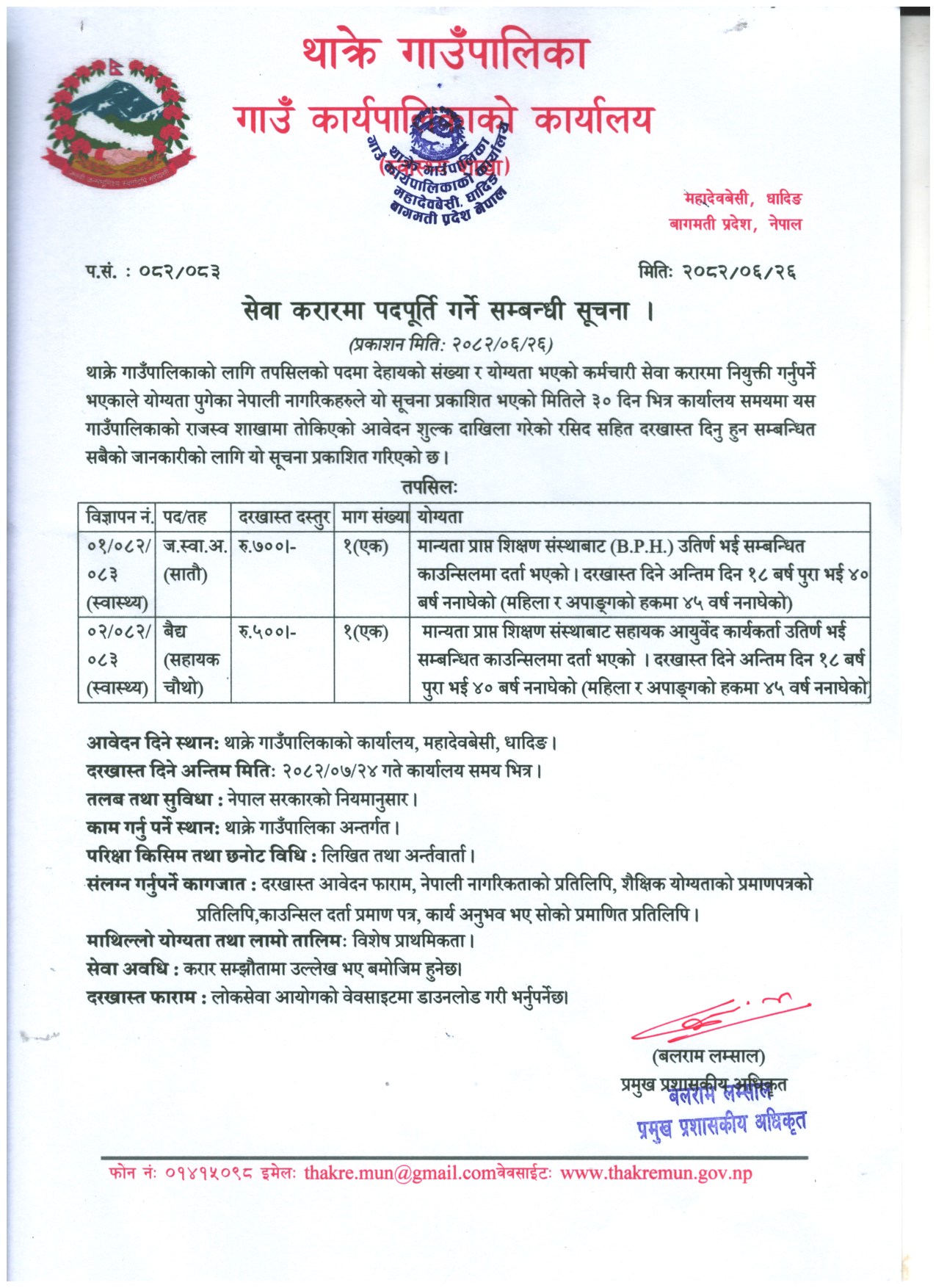 Public Health Officer | Vaidya | public health jobs 2025: According to the decision of the Government of Nepal dated 2073.11.9, Thakre Rural Municipality was formed after its publication in the Gazette on 2073.11.27. During the local level restructuring, Thakre Rural Municipality was formed by merging the former Kewalpur, Thakre, Tasarpu, Bhumesthan and Goganpanika wards no. 5, 6, 7 and 8 of Dhading district. Currently, there are 11 wards in this rural municipality. The area of Thakre Rural Municipality thus formed is 96.41 sq km. It is bordered by Dhunibeshi Municipality in the east, Galchhi Rural Municipality in the west, Galchhi Rural Municipality and Nuwakot District in the north and Makawanpur District in the south. This rural municipality is 32.5 km from Kathmandu. According to the National Census 2078, the population of this rural municipality is 32,374.
