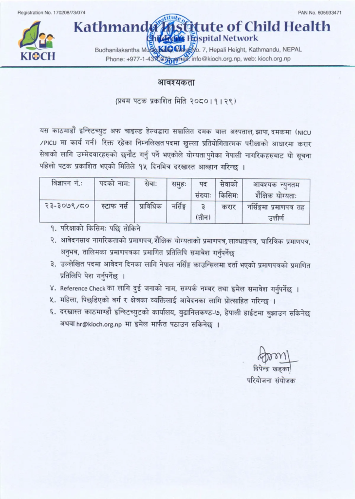 Staff nurse| kioch| nursing jobs 2023: KIOCH [Kathmandu Institute of Child Health] is a not-for-profit organization established in 2017. It aims to deliver integrated multispecialty high-quality child healthcare that is affordable, accessible, and available to all, thus advancing Quality of Life of Children in Nepal. KIOCH focuses on providing solutions to ever rising healthcare needs and consistent poor health outcomes for millions of children in Nepal. It believes on timely adaptation of scientific medical advances, technologies and valued people-centered care that are of international standards.KIOCH is led by a group of professionals actively engaged in social welfare and well-being of people. The team comprises of diverse expertise with proven leadership in the field of medical science, social welfare, social enterprise, public communication, and community empowerment, among others.
